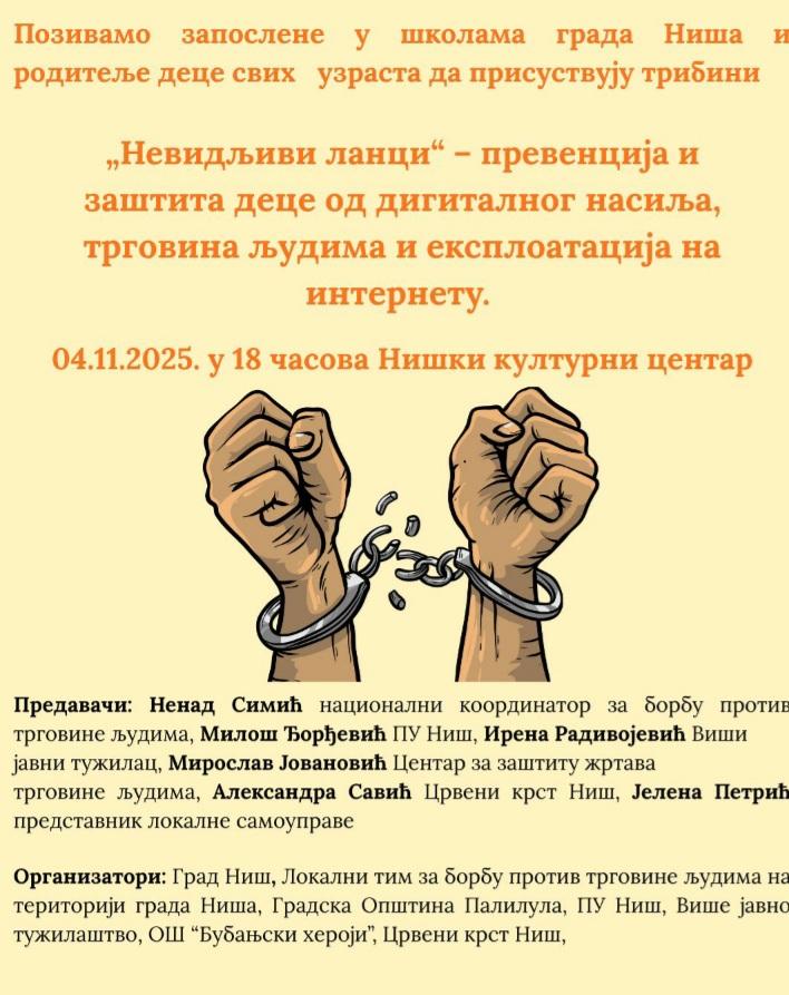 У циљу подизања свести о опасностима које вребају децу на интернету, као и превенције дигиталног насиља и трговине људима, у Нишу ће бити одржана трибина под називом „Невидљиви ланци“. Трибина је заказана за 4. новембар 2025. године у 18 сати у Нишком културном центру. Намењена је запосленима у школама и родитељима деце свих узраста, са циљем да се пружи више информација о начинима заштите младих у дигиталном окружењу и превенцији различитих облика злоупотребе. Међу предавачима ће бити Ненад Симић, национални координатор за борбу против трговине људима, Милош Ђорђевић из Полицијске управе Ниш, Ирена Радивојевић, виши јавни тужилац, као и Мирослав Јовановић из Центра за заштиту жртава трговине људима. Своја искуства и савете поделиће и Александра Савић из Црвеног крста Ниш и Јелена Петрић, представник Града Ниша која јесте кординатор Локалног тима за борбу против трговине људима. Организатори трибине су Град Ниш, Локални тим за борбу против трговине људима, Градска општина Палилула, Полицијска управа Ниш, Више јавно тужилаштво, ОШ „Бубањски хероји“ и Црвени крст Ниш.